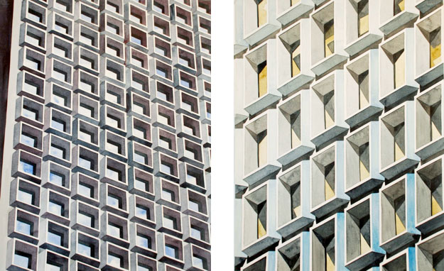 Watching footage of swaying buildings in Japan from the recent earthquake, it is hard not to marvel at the work of engineers who design our modern skyscapers. Artist Amy Park scales the heights with her delicate watercolors.
