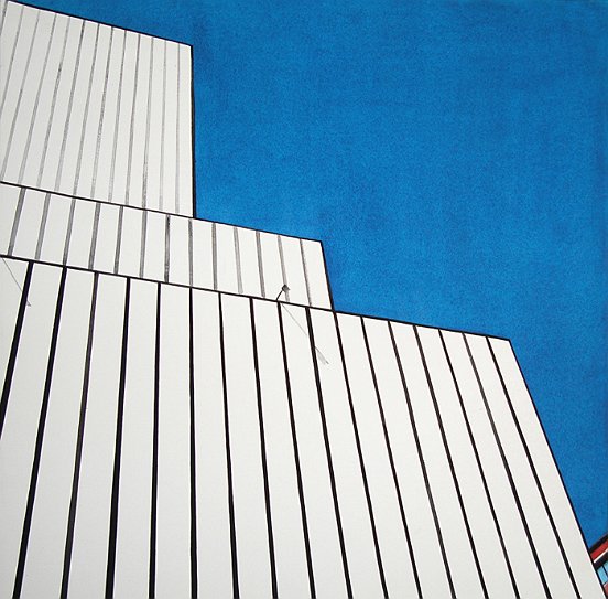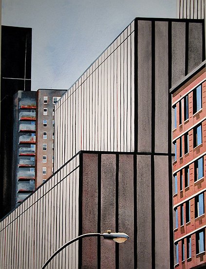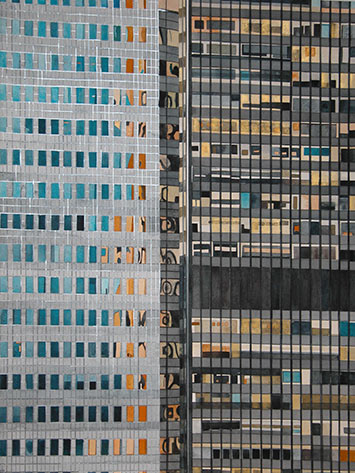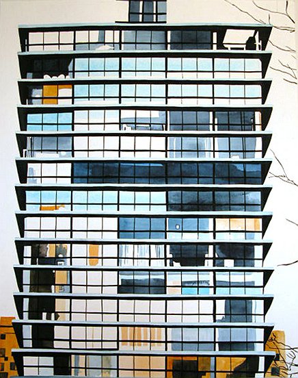 What a great find, Betsy! An artist who is as fascinated by those glass wall reflections as many of us and she captured the geometry that frames an ever changing shimmer of sky and light! Love it!