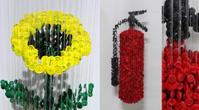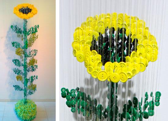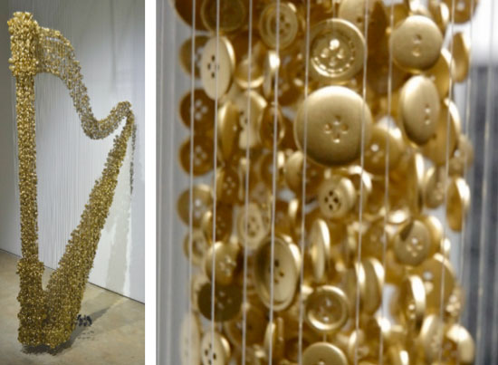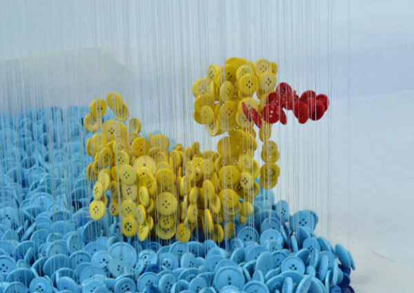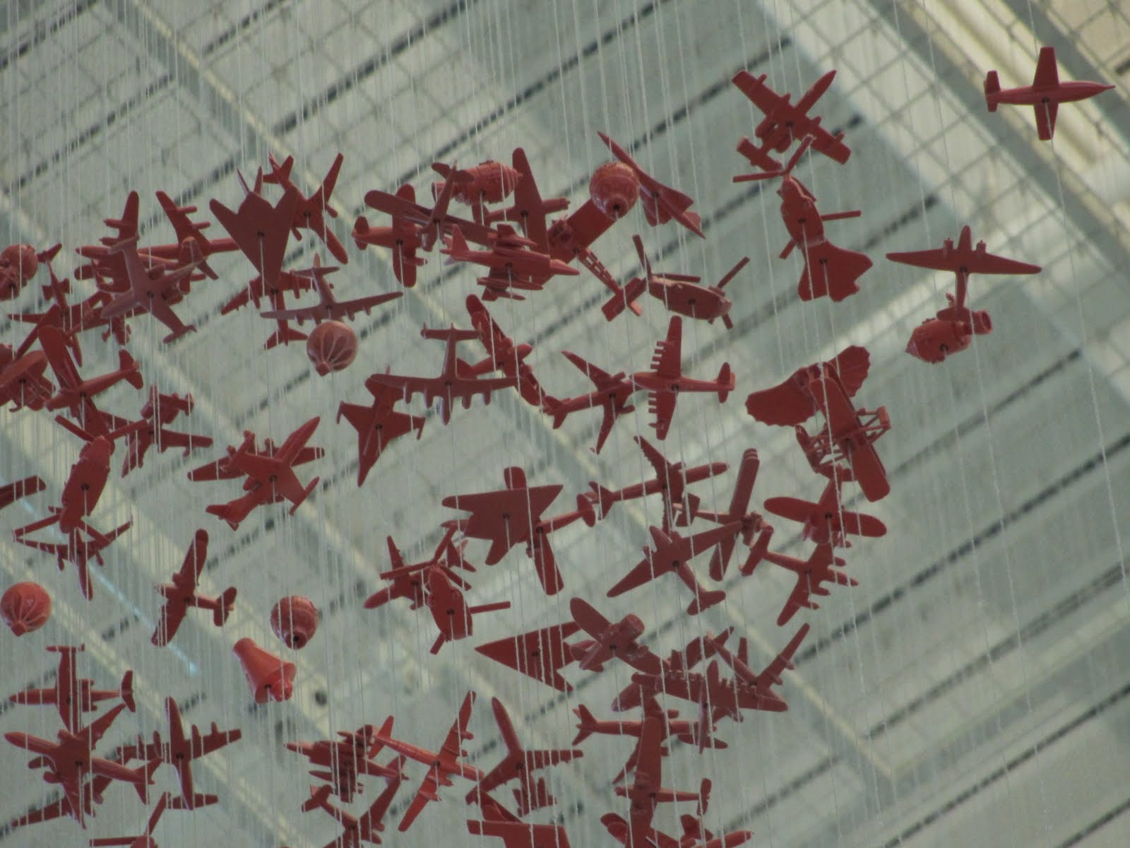 Airports are depressing by design, but on top of this, they are shopping wastelands Think about it, where else is there such a captive audience and yet all that occupies the real estate are fast food establishments and shops with names like the “Spirit of the Red Horse”?. Are you kidding me? Offering some relief, many municipalities have tried to inject a bit of public art into the mix. One of my favorites is in the Chicago Midway Airport. If you’ve been there, you have no doubt seen a hanging sculpture of a bird constructed entirely of miniature toy bombs and airplanes by Ralph Helmick. In the same vein, Miami artist Augusto Esquivel fastens together these amazing sculptures made entirely of buttons.