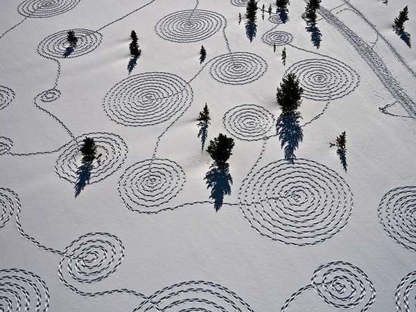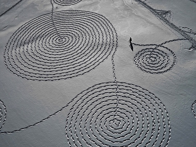 From another favorite blog “thiscolassal“: “Step by step this massive snow drawing was trampled into freshly fallen snow by artistSonja Hinrichsen with the help of 5 volunteers last month at Rabbit Ears Pass in Colorado. I love that a piece so expansive and yet so temporary can be created with a few pairs of well choreographed snow boots.”