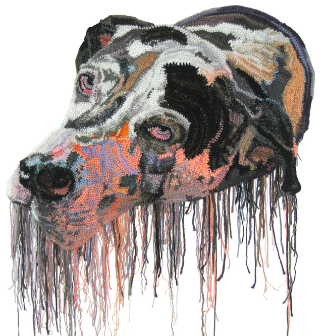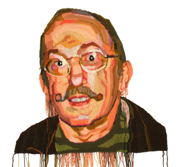 What I like about Hamilton’s portraits is the effect of dimension he achieves through crochet. From what I can tell from the above images, he’s using only single chain stitch. Dimension must come from a combo of color choice and crocheting free-form. Compelling!