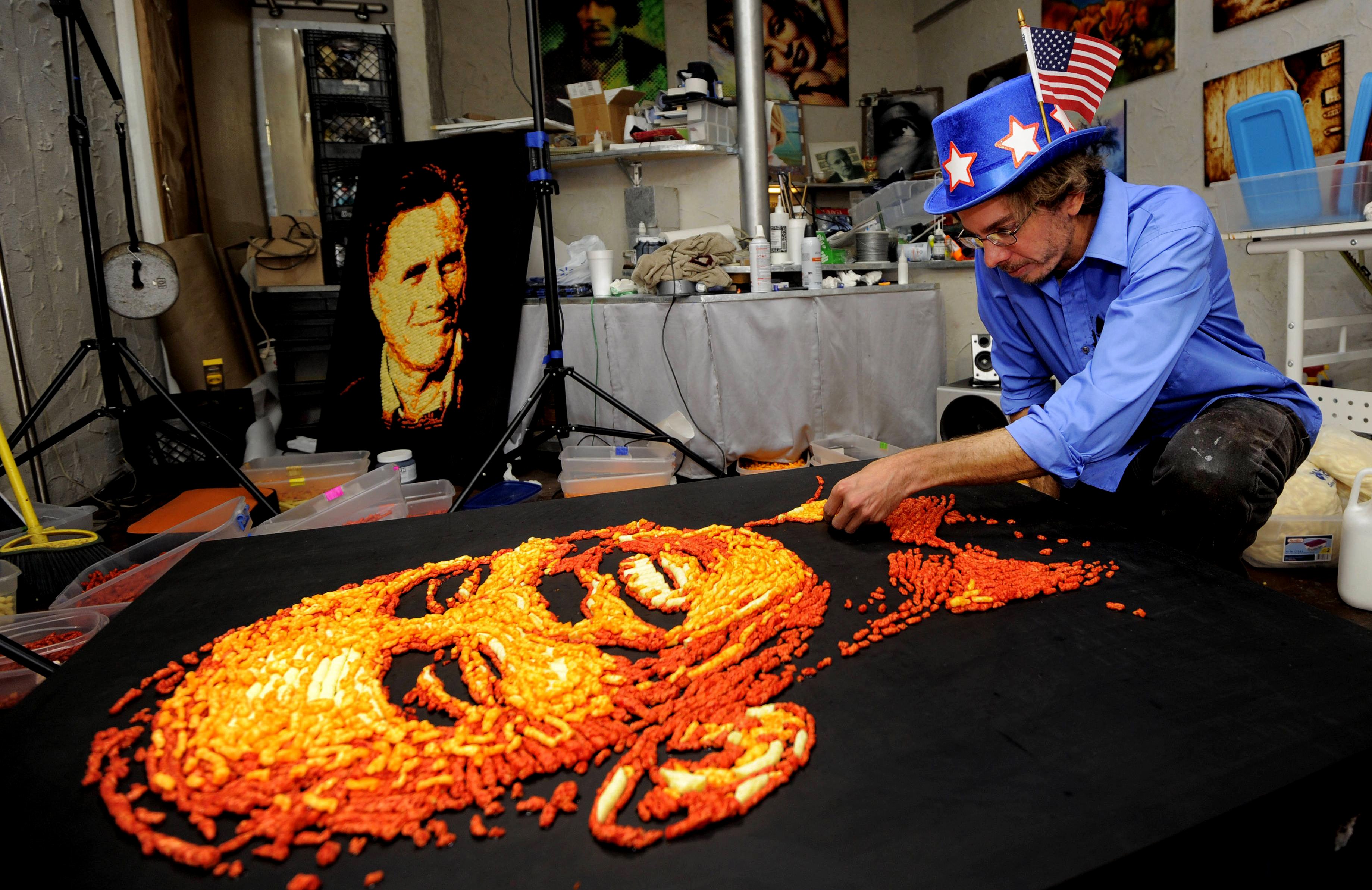 Everyone is all puffed up over the election, but no one more than artist Jason Baalman. PepsiCo, owner of the Cheetos brand, commissioned him to portray the contenders in an warmer, “orangier” light. Mission accomplished.