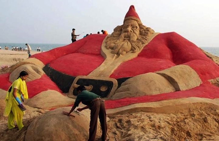 Pattnaik’s main focus is to build beautiful designs without compromising on the purity of the natural substance. Recently, he and thirty of his students designed an installation featuring 500 Santa Clauses along a sandy beach in Puri, India. The Santas are built in all shapes and sizes, and grow directly out of the ground. At the peak of the installation is a giant Jesus with a message carved into the gritty earth: “Go green, save earth.” Pattnaik says, “I always try to give some awareness messages through my sculpture to the world so I chose the awareness about global warming through Santas as the subject of the year end.”