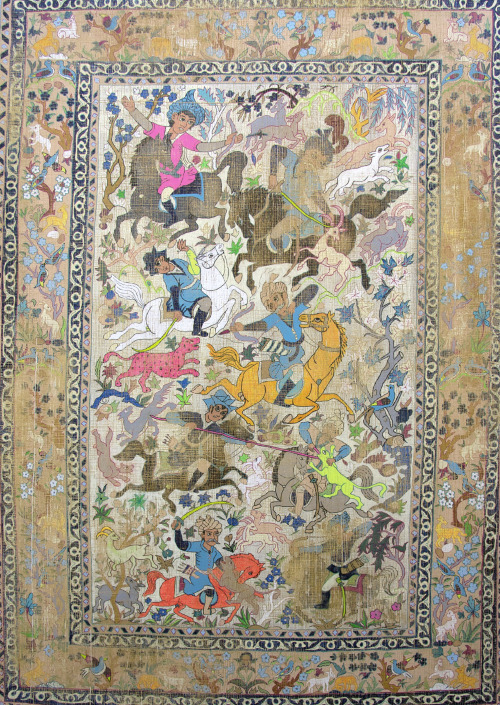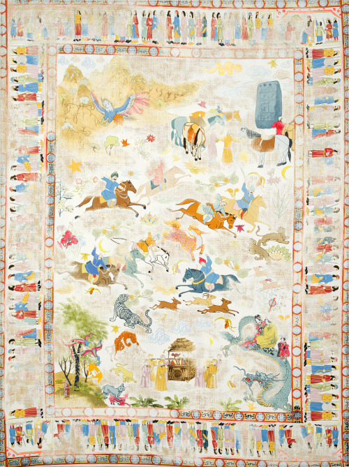 Kour Pour, a young Los Angeles-based artist adds his own twist to the story. His large-scale paintings may themselves be a year in creation. His process includes a mixture of canvas preparation to mimic the weave and weft, silk screen, and over-painting. The results are no doormat.