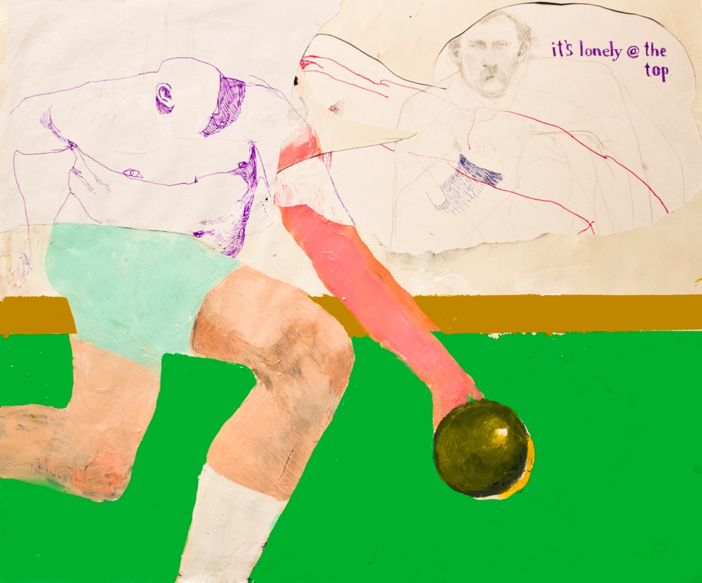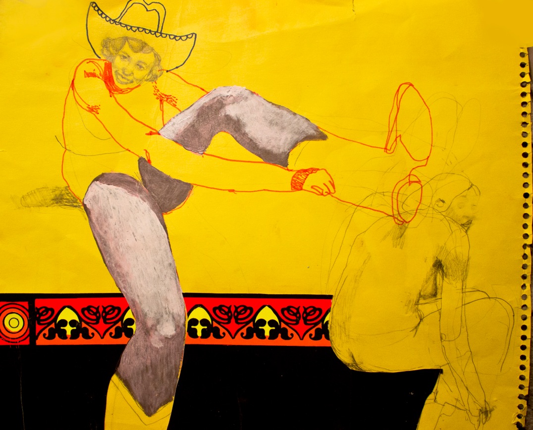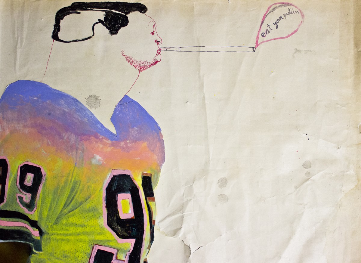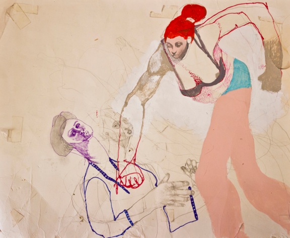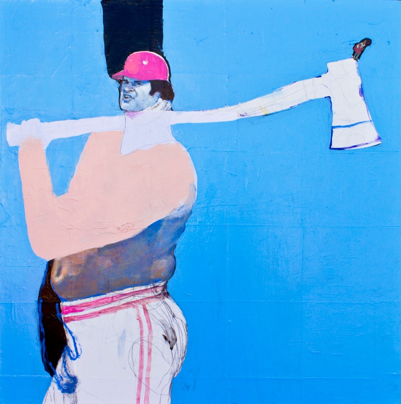 Tyler Hildebrand isn’t into the flowery side of things either. His paintings depict some battling characters who are as far from Downton as one can get. No tea served here.